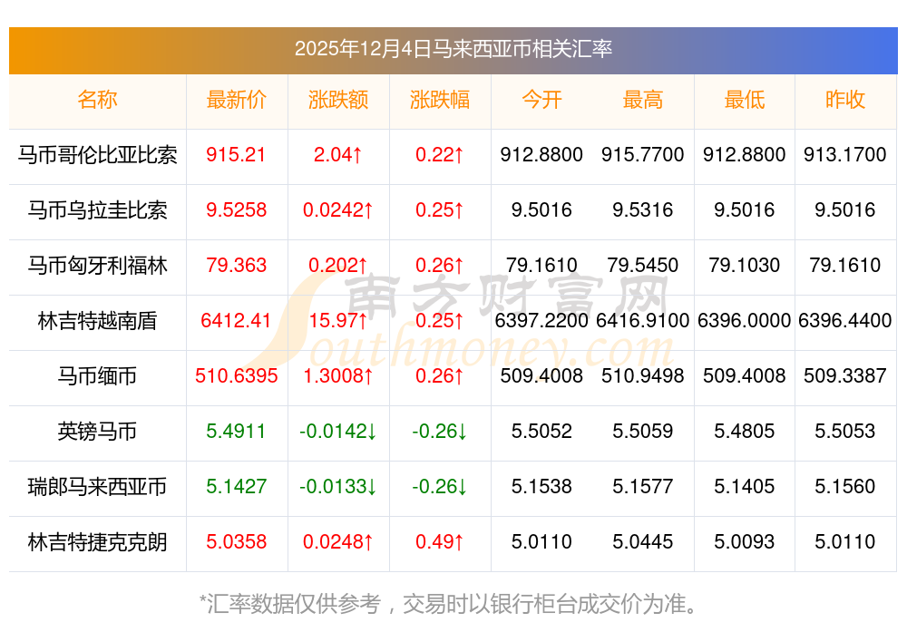 2025年12月4日马来西亚币兑换挪朗最新汇率:2.450980,今开:2.4437,昨收:2.4394,最高:2.4570,最低:2.4390。