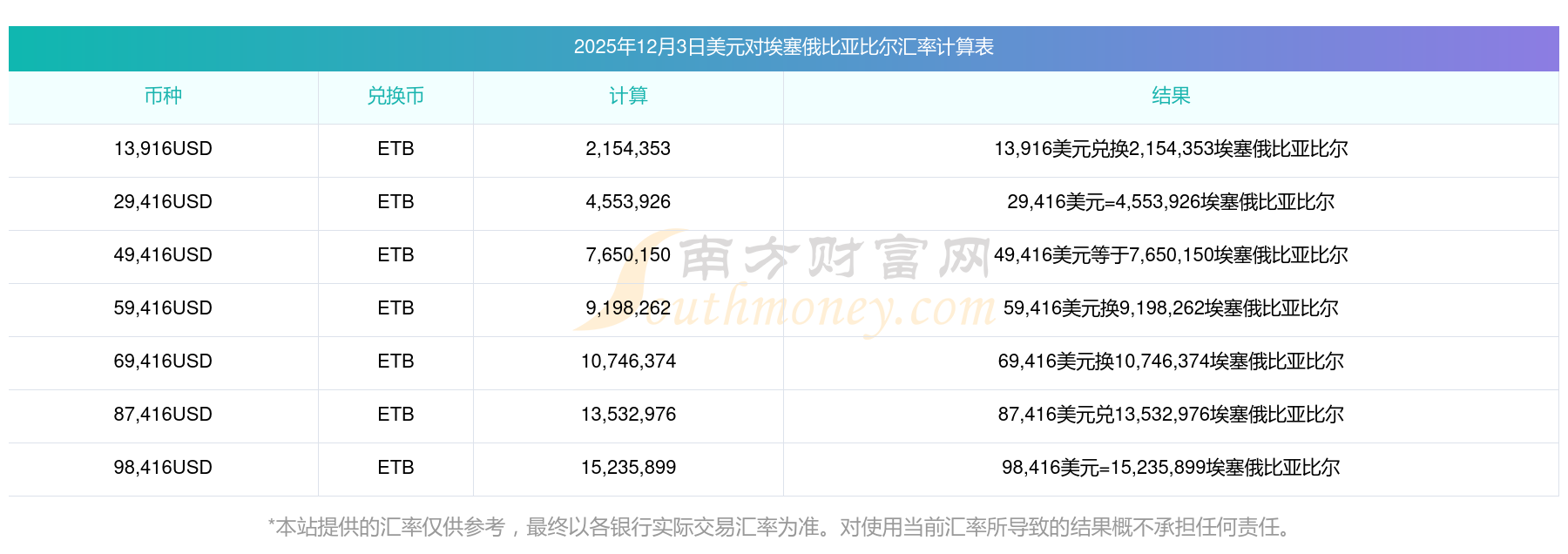 2025年12月3日埃塞俄比亚比尔换美元汇率是:0.00646