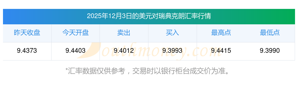 2025年12月3日今天汇率,换算美元(USD)到瑞典克朗(SEK):