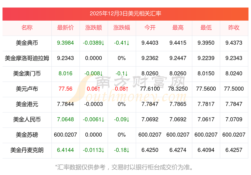 2025年12月3日美元相关汇率查询