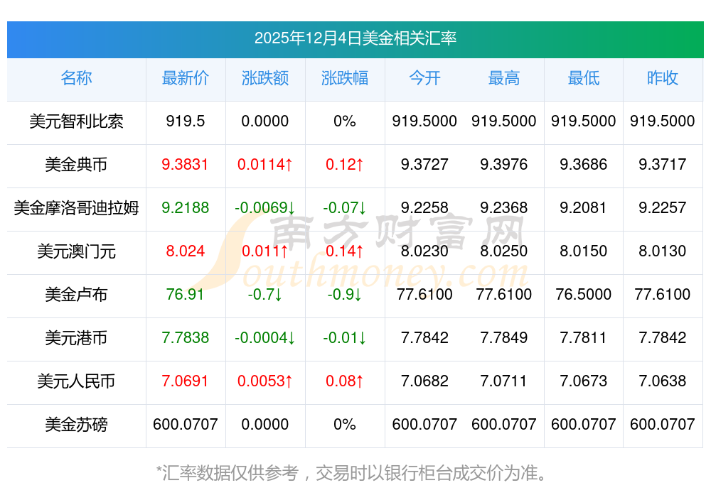 根据2025年12月4日汇率,美金兑换牙买加元汇率最新价160.260000,今开价160.2600,昨收价160.2600,最高价160.5000,最低价160.2600。