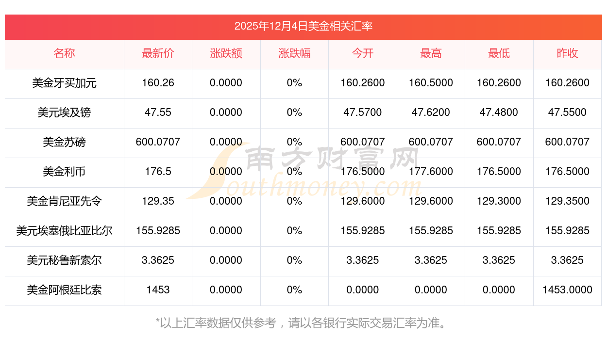 2025年12月4日美金相关汇率查询