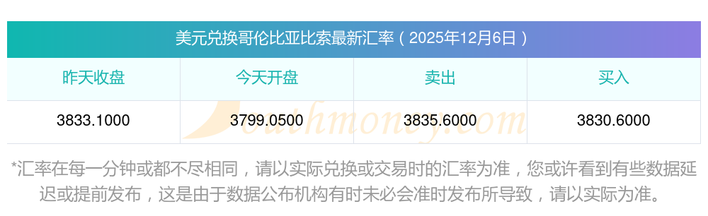 美元汇率行情:美元与哥伦比亚比索兑换多少?2025-12-6