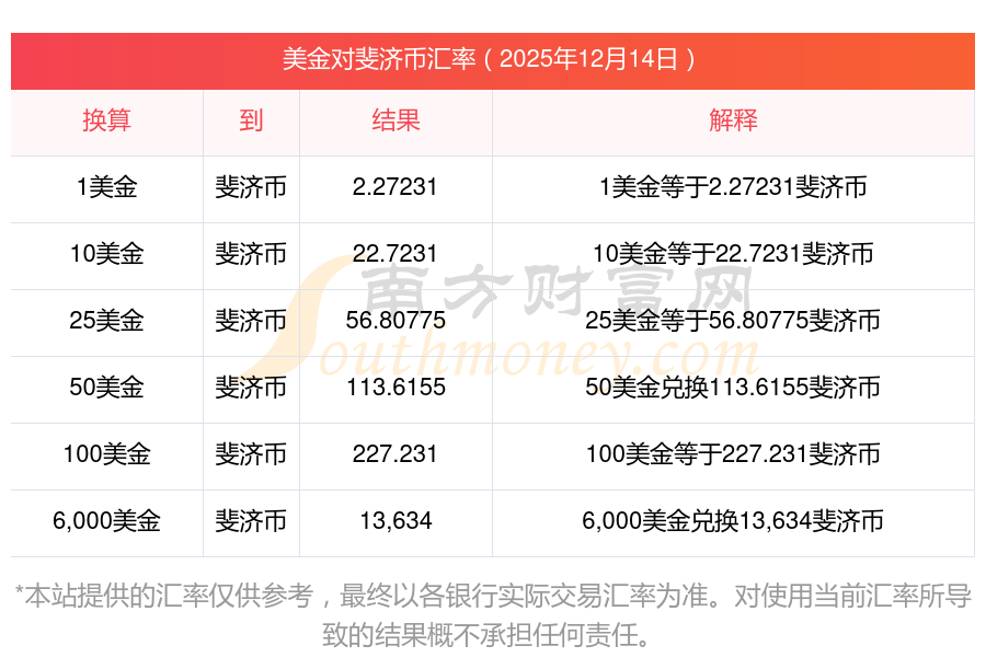 2万美金购汇斐济币是多少_汇率价格 2025年12月14日