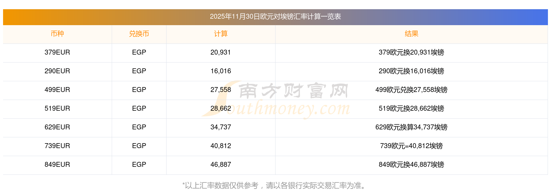 今日欧元汇价:2025年11月30日15欧元兑埃镑汇价一览表