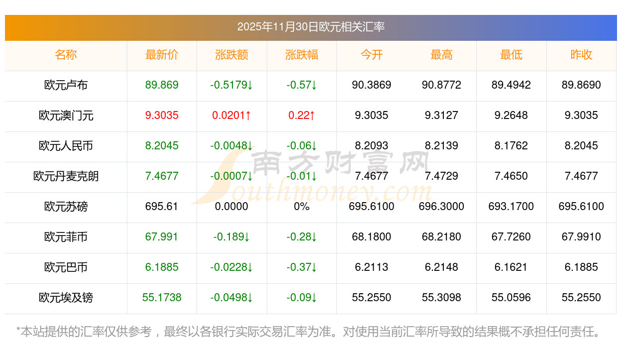 2025年11月30日欧元相关汇率查询