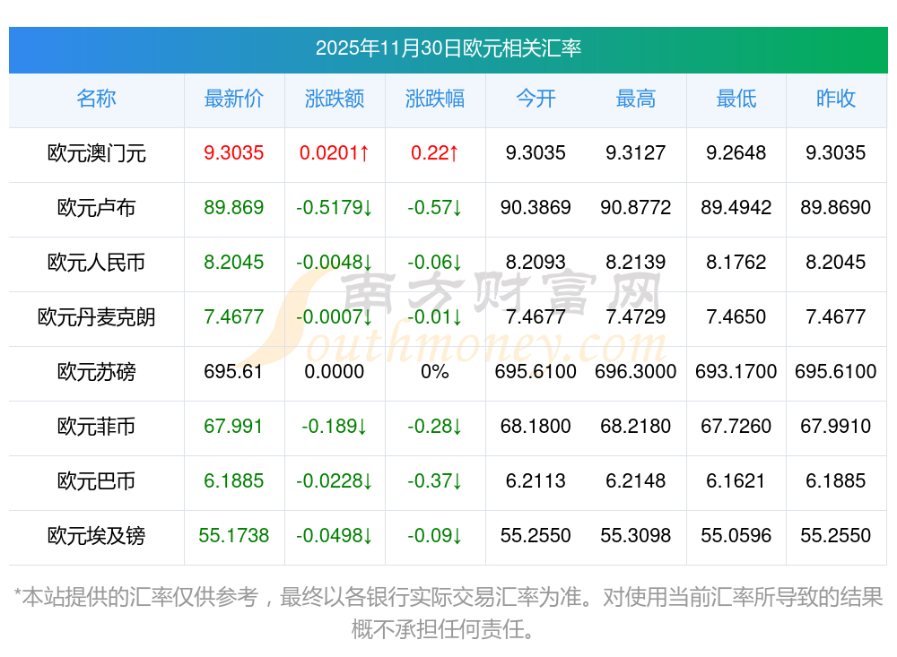 2025年11月30日欧元相关汇率查询
