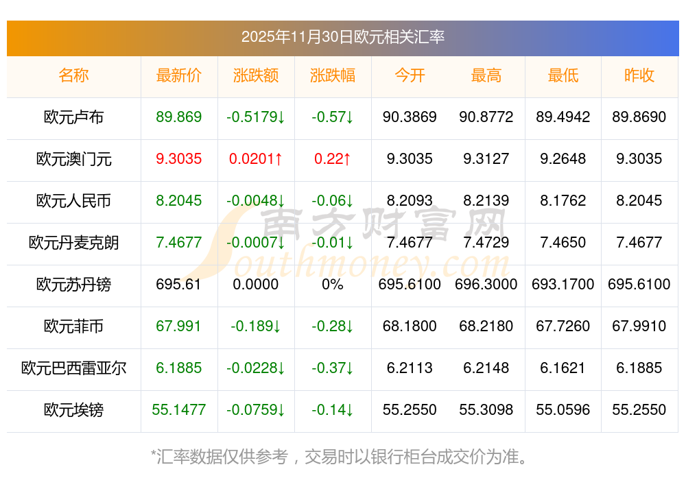 根据2025年11月30日汇率计算,EUR兑换GBP汇率最新价0.876000,今开价0.8758,昨收价0.8760,最高价0.8774,最低价0.8747。