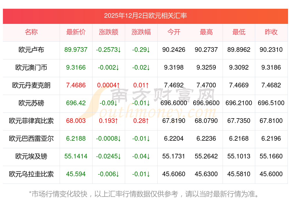 2025年12月2日欧元相关汇率查询