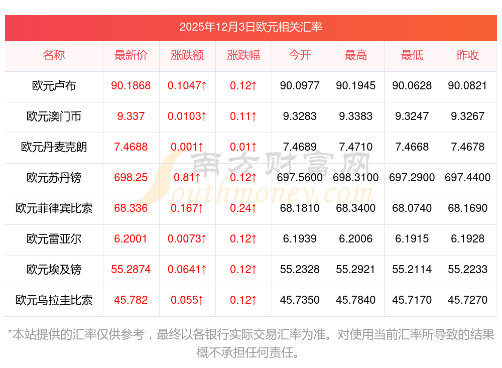 2025年12月3日欧元相关汇率查询