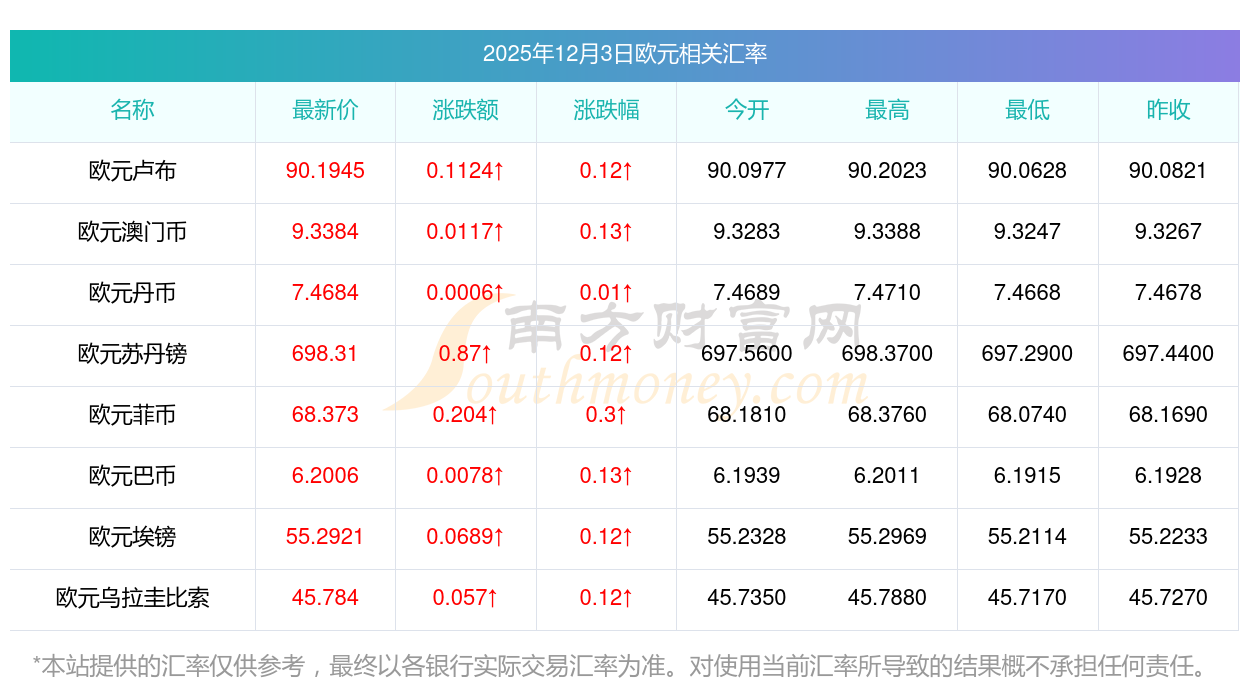 根据2025年12月3日汇率,欧元兑换利比里亚元汇率最新206.060000,今开205.7700,昨收205.7400,最高206.7100,最低205.6900。