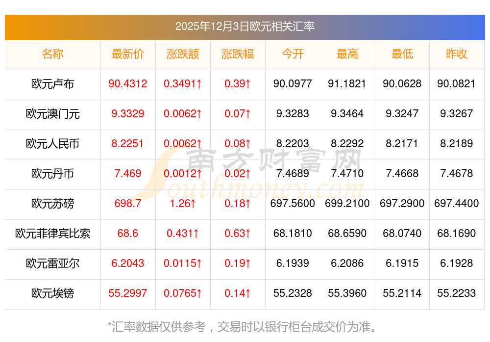 根据2025年12月3日汇率,欧元兑换秘鲁新索尔汇率最新价3.921500,今开价3.9156,昨收价3.9149,最高价3.9242,最低价3.9141。