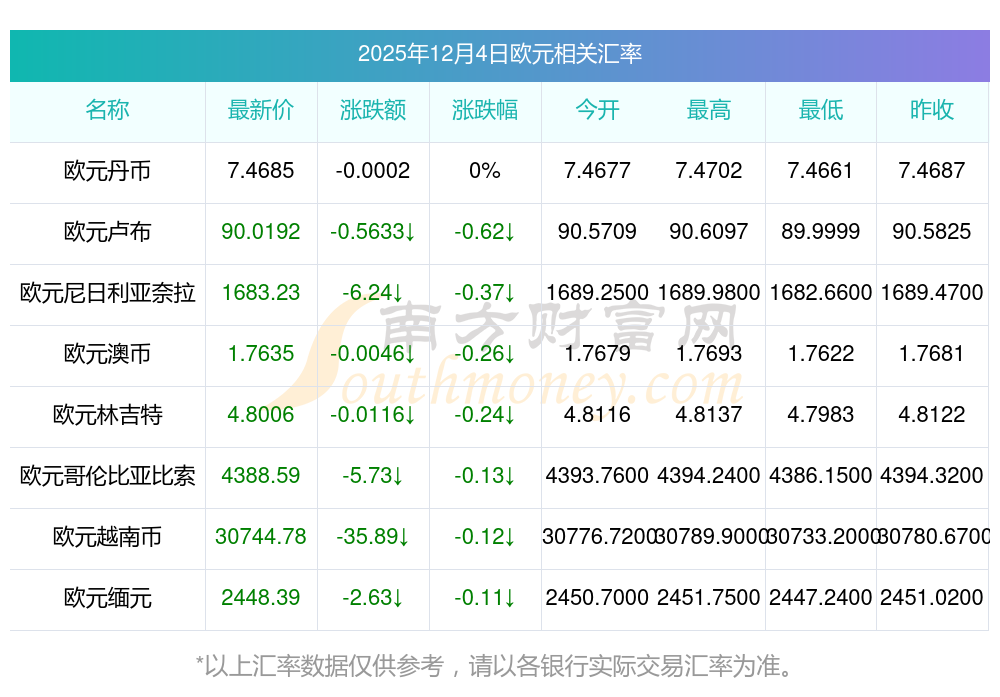 2025年12月4日欧元相关汇率查询