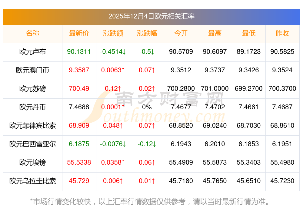 根据2025年12月4日汇率,欧元兑换巴西雷亚尔汇率最新价6.187500,今开价6.1943,昨收价6.1951,最高价6.2010,最低价6.1853。