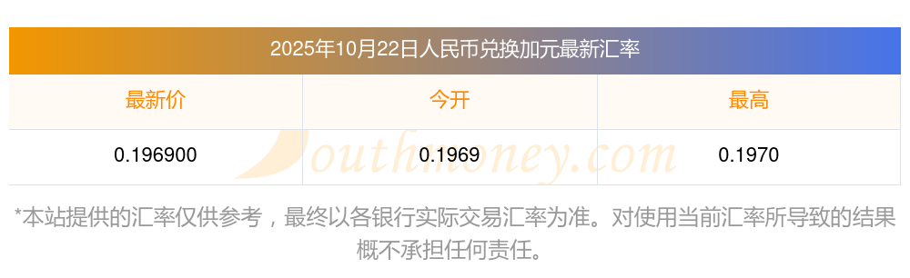 汇价查询:2025年10月22日人民币兑加元汇价一览