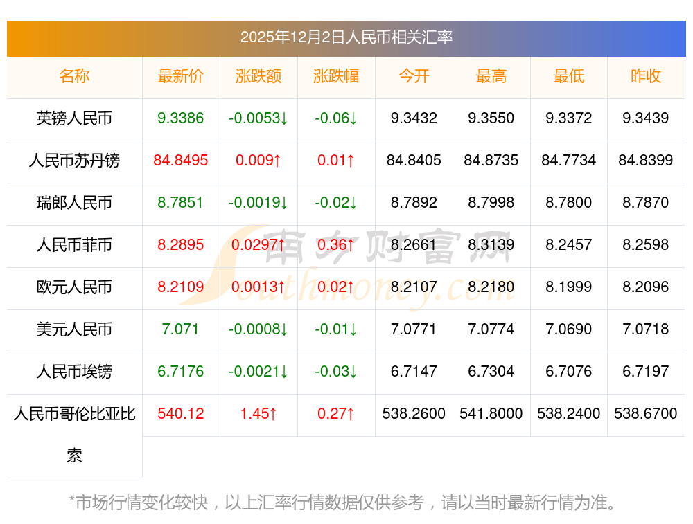 根据2025年12月2日汇率,人民币兑换克朗汇率最新价2.944100,今开价2.9433,昨收价2.9429,最高价2.9480,最低价2.9396。