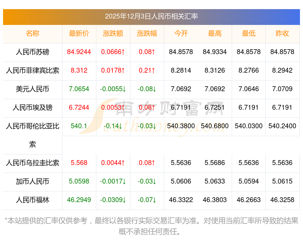 各大货币汇率行情: 人民币兑换美元汇率价格查询12月3日
