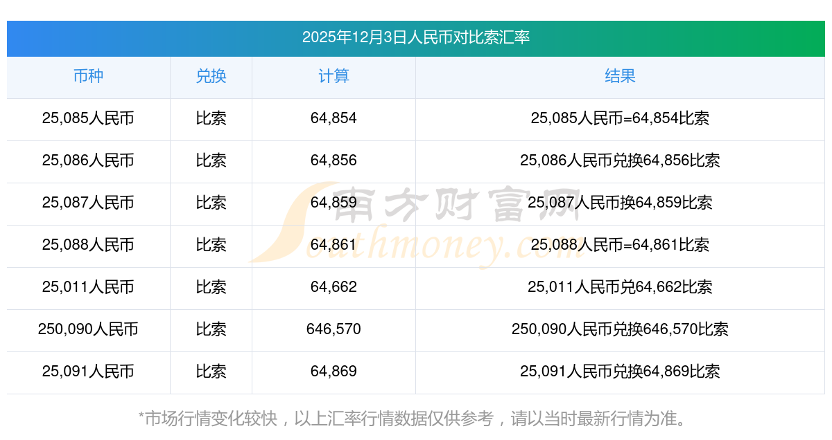 2025年12月3日美元人民币中间价7.0754,新加坡元人民币中间价5.4544,纽元人民币中间价4.0567,100日元人民币中间价4.536,港币人民币中间价0.909,英镑人民币中间价9.3429,欧元人民币中间价8.221,人民币南非兰特中间价2.4206,人民币土耳其里拉中间价6.009,人民币泰铢中间价4.5265,人民币瑞典克朗中间价1.3336,人民币沙特里亚尔中间价0.531,人民币卢布中间价10.9574,人民币波兰兹罗提中间价0.515,人民币挪威克朗中间价1.4328,人民币林吉特中间价0.5842,人民币墨西哥比索中间价2.5855,人民币澳门元中间价1.1336,人民币韩元中间价207.71,人民币匈牙利福林中间价46.3451,人民币丹麦克朗中间价0.9087,人民币阿联酋迪拉姆中间价0.5196,瑞士法郎人民币中间价8.8047,加元人民币中间价5.0589。