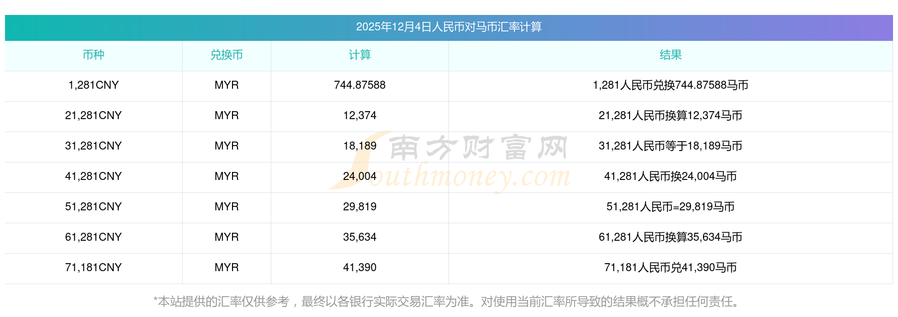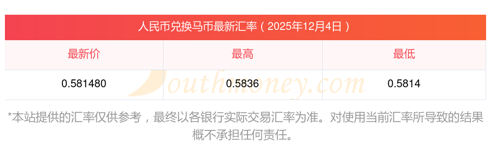 今日汇率:2025年12月4日人民币兑马币汇价一览