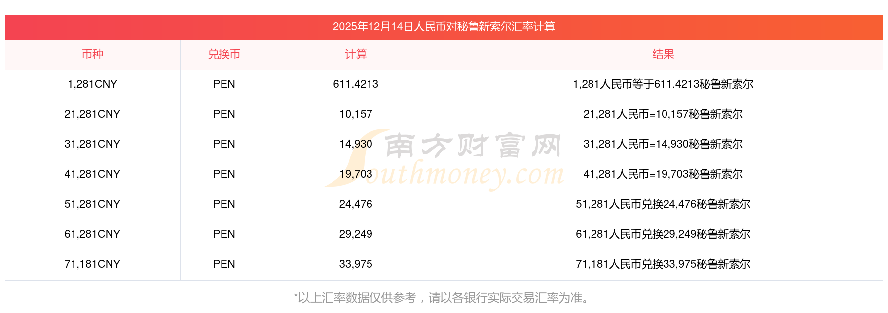 今天汇率更新!2025年12月14日71人民币兑换秘鲁新索尔是多少?
