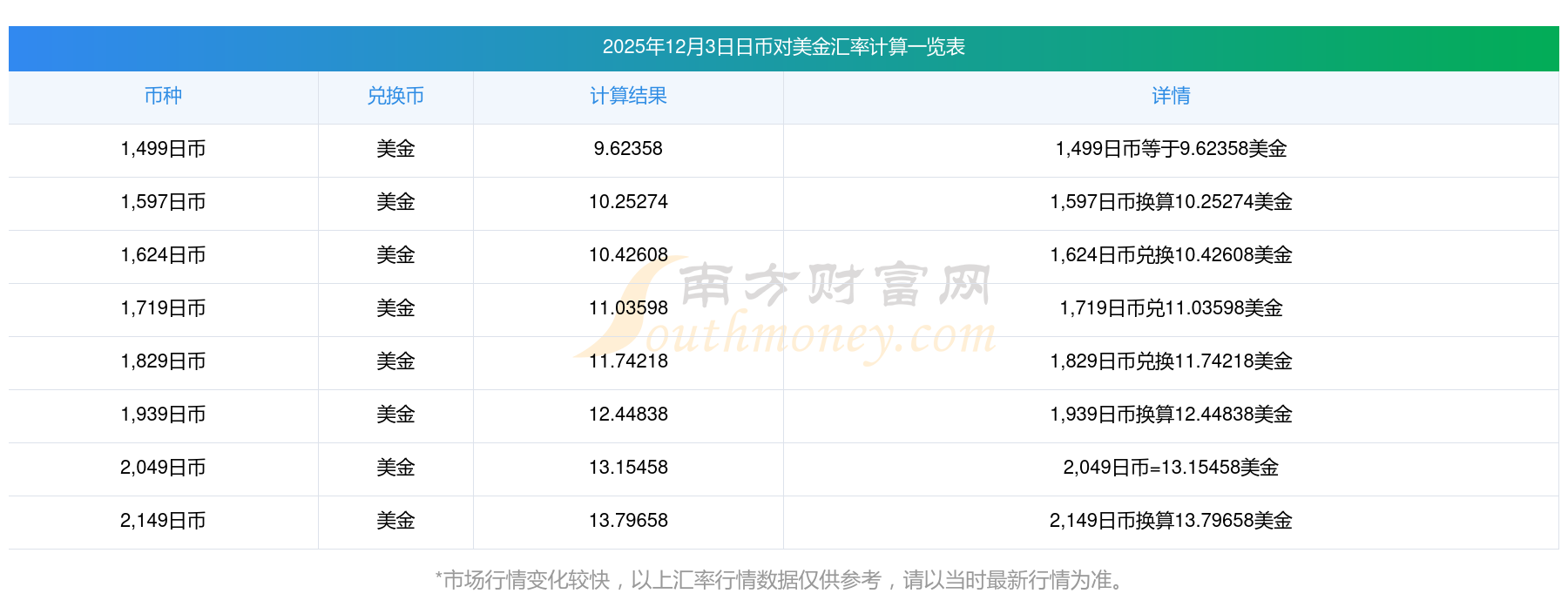 2025年12月3日日币与美金的兑换汇率计算如下: