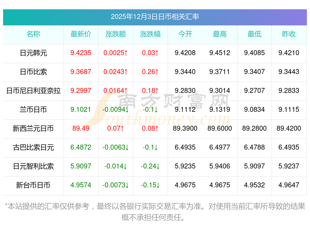 根据2025年12月3日汇率计算,日币兑换港币汇率最新价0.050084,今开价0.0499,昨收价0.0499,最高价0.0501,最低价0.0499。