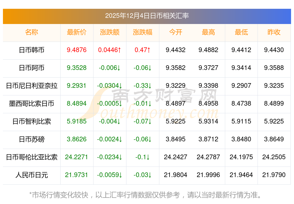 根据2025年12月4日汇率,日币兑换挪币汇率最新0.064758,今开0.0649,昨收0.0648,最高0.0653,最低0.0647。