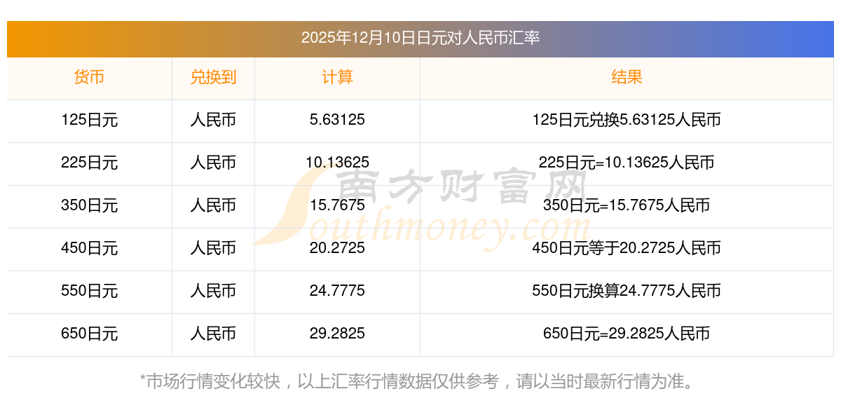 今日2025年12月10日汇价:3日元兑人民币汇价表