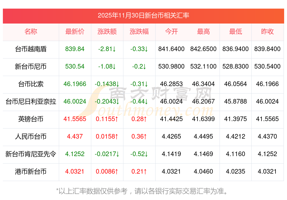 根据2025年11月30日汇率,新台币兑换捷克币汇率最新0.662900,今开0.6629,昨收0.6629,最高0.6666,最低0.6623。