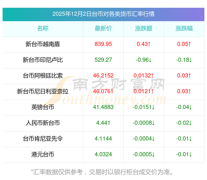 根据2025年12月2日汇率,台币兑换瑞郎汇率最新价0.025608,今开价0.0256,昨收价0.0256,最高价0.0257,最低价0.0255。