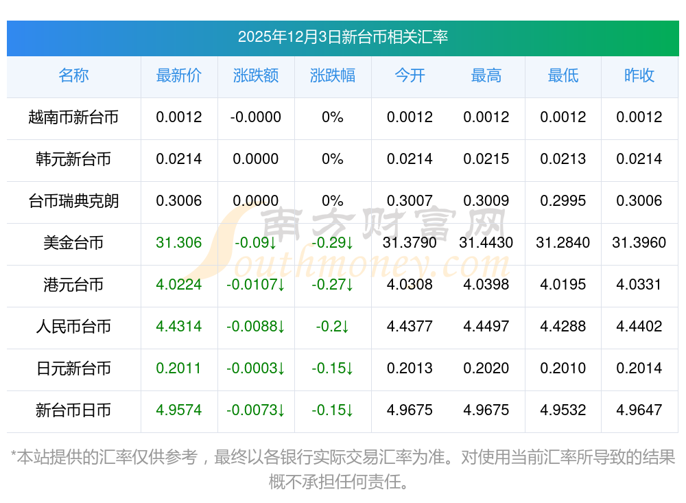 2025年12月3日新台币相关汇率查询