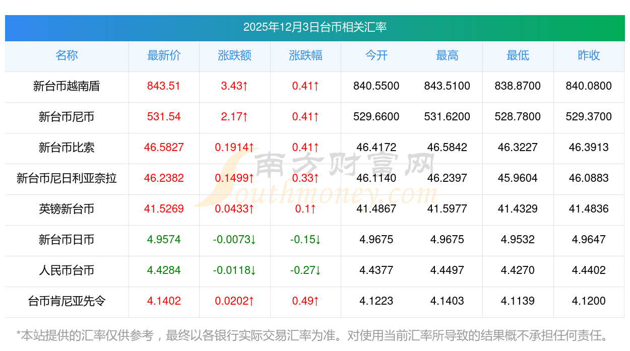 根据2025年12月3日汇率,台币兑换新西兰元汇率最新价0.055680,今开价0.0555,昨收价0.0555,最高价0.0557,最低价0.0553。