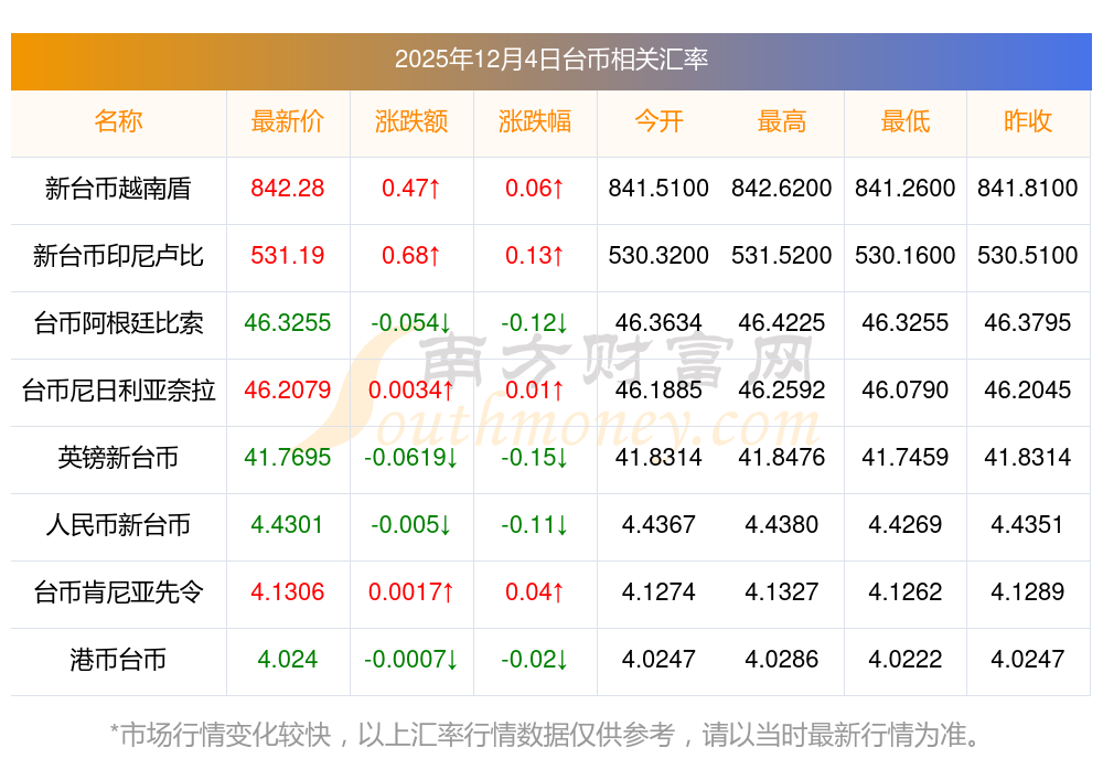 根据2025年12月4日汇率计算,TWD兑换ARS汇率最新价46.325540:今开价46.3634,昨收价46.3795,最高价46.4225,最低价46.3255。