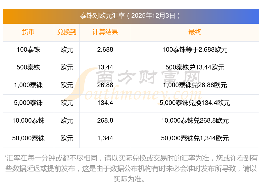 南方财富网为您提供泰铢对欧元汇率最新价格详情。