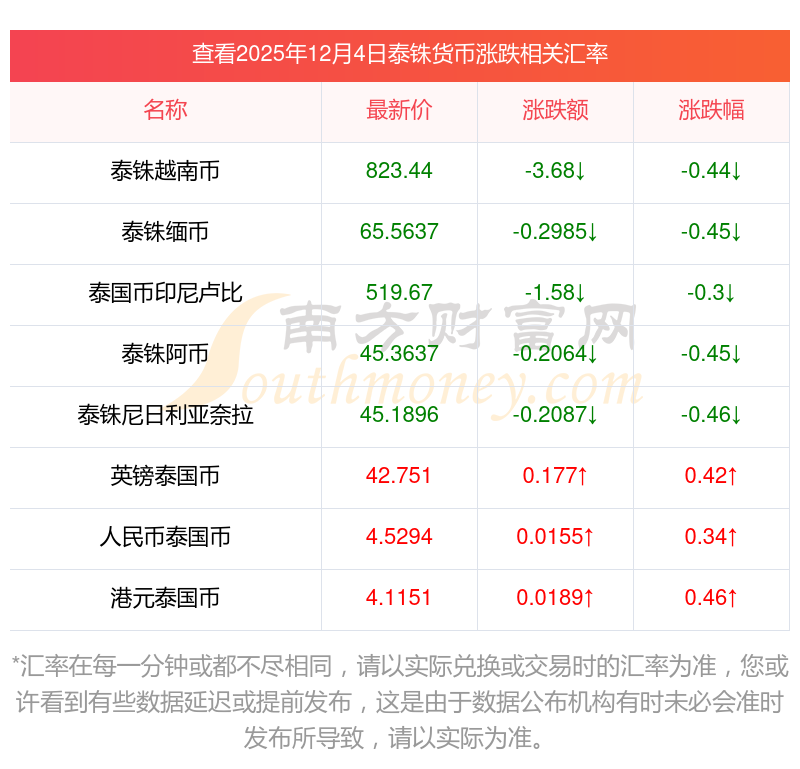 根据2025年12月4日汇率,泰铢兑换马来西亚币汇率最新0.128420,今开0.1293,昨收0.1293,最高0.1294,最低0.1282。