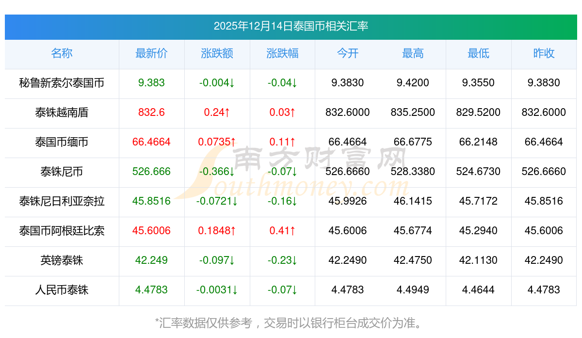 根据2025年12月14日汇率计算,THB兑换EGP汇率最新价1.502930:今日开价1.5047,昨日收价1.5047,最高价1.5094,最低价1.4990。
