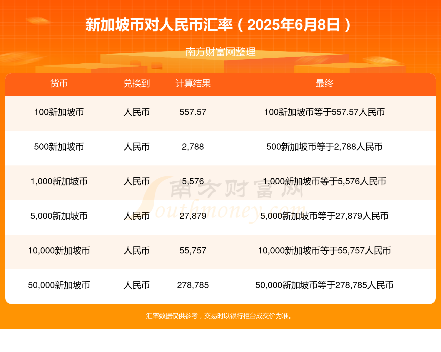 今天四新加坡币等于多少人民币(2025年6月8日)