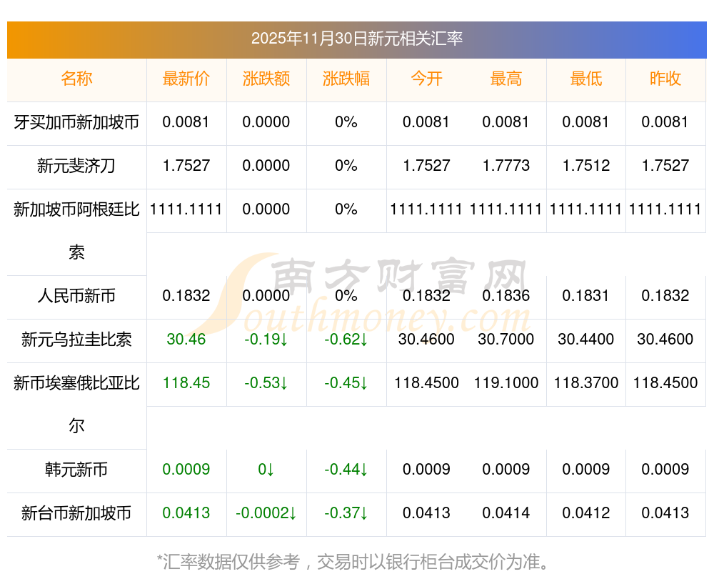 根据2025年11月30日汇率,新元兑换牙买加币汇率最新价123.640000,今开价123.6500,昨收价123.6400,最高价123.8500,最低价123.2900。
