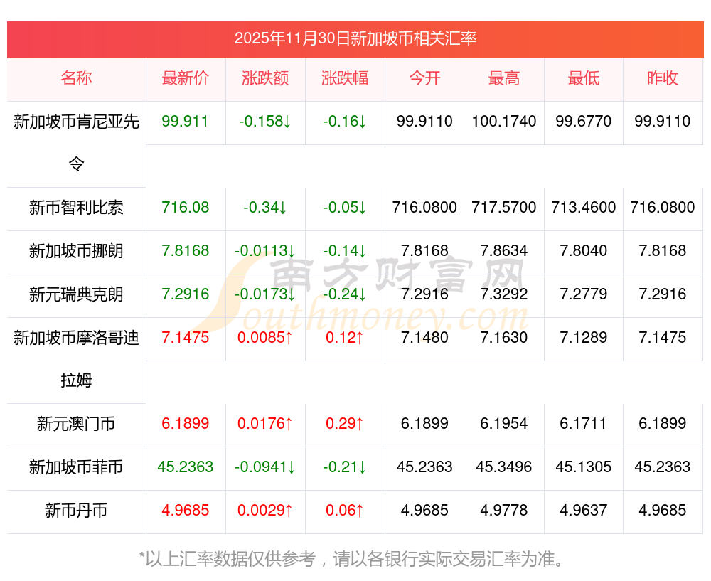根据2025年11月30日汇率计算,SGD兑换MAD汇率最新价7.147500:今日开价7.1480,昨日收价7.1475,最高价7.1630,最低价7.1289。