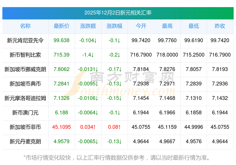 根据2025年12月2日汇率计算,SGD兑换ETB汇率最新价119.050000:今日开价119.1900,昨日收价119.1900,最高价119.2300,最低价119.0400。