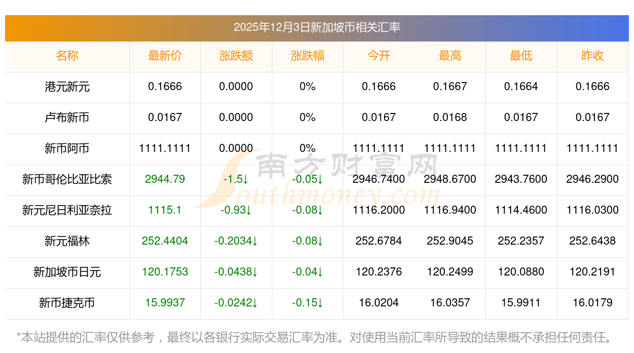 2025年12月3日新加坡币相关汇率查询