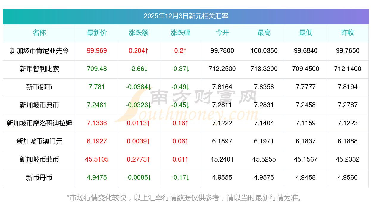 根据今天2025年12月3日汇率计算,SGD兑换UYU汇率最新价30.390000,今开价30.3500,昨收价30.3400,最高价30.4000,最低价30.3200。