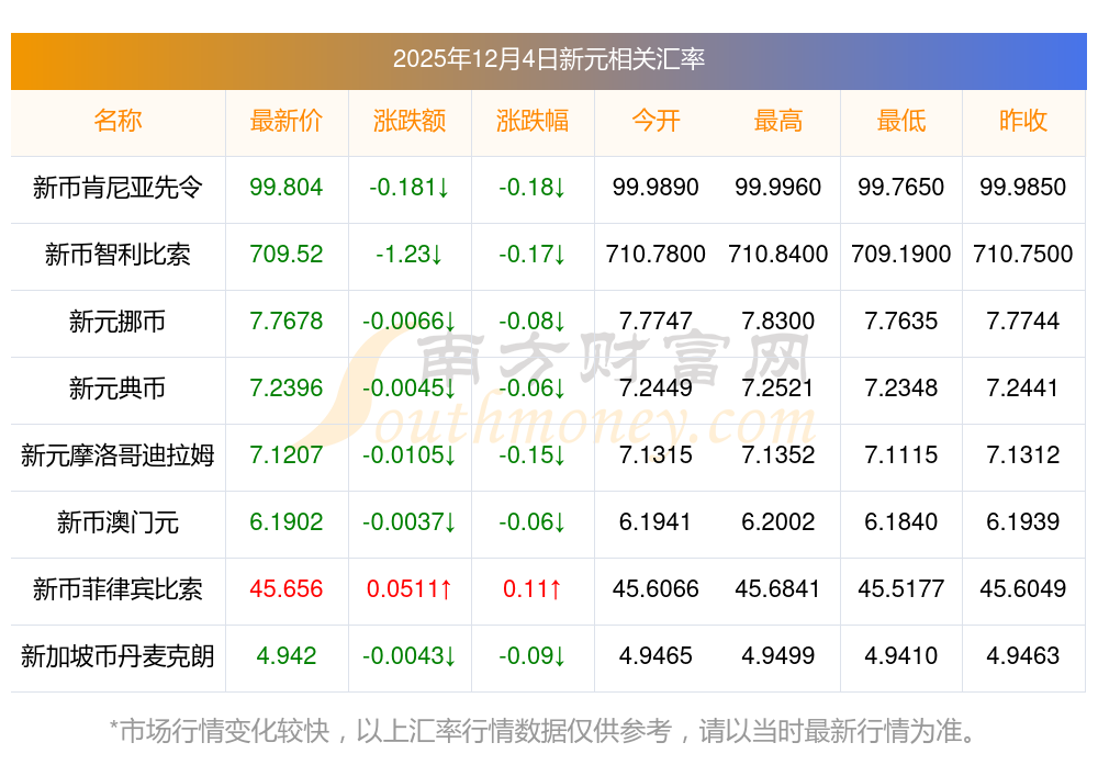 根据2025年12月4日汇率,新元兑换挪币汇率最新7.767800,今开7.7747,昨收7.7744,最高7.8300,最低7.7635。
