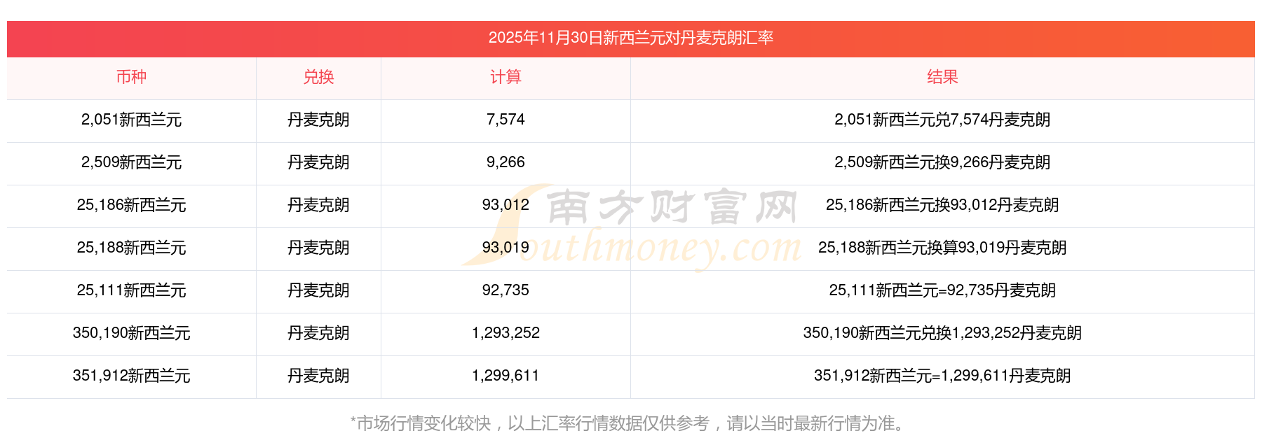 2025年11月30日新西兰元对丹麦克朗的汇率为:3.693