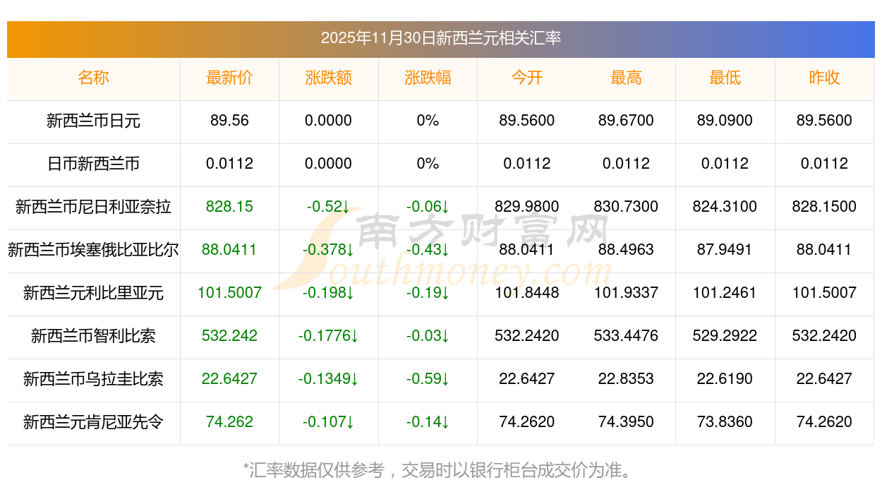 2025年11月30日新西兰元相关汇率查询
