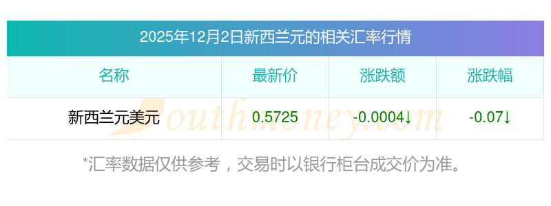 2025年12月2日新西兰元兑换美元最新汇率:0.572500,今开:0.5727,昨收:0.5729,最高:0.5738,最低:0.5719。