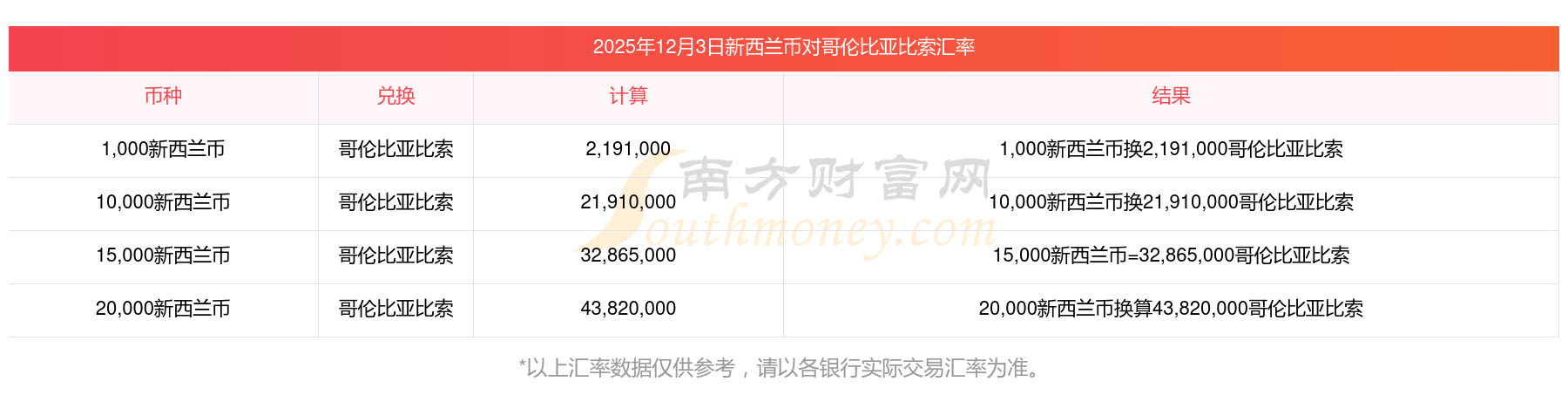 汇率实时更新!69新西兰币兑换哥伦比亚比索汇率表(2025年12月3日)