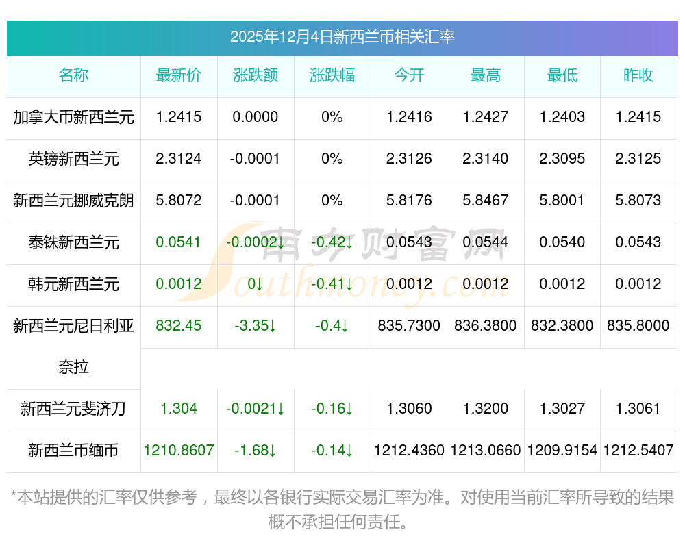 2025年12月4日新西兰币相关汇率查询