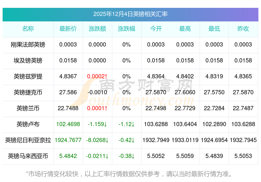 根据2025年12月4日汇率计算,GBP兑换SDG汇率最新价801.124500:今日开价801.2449,昨日收价801.2445,最高价801.3347,最低价799.7443。