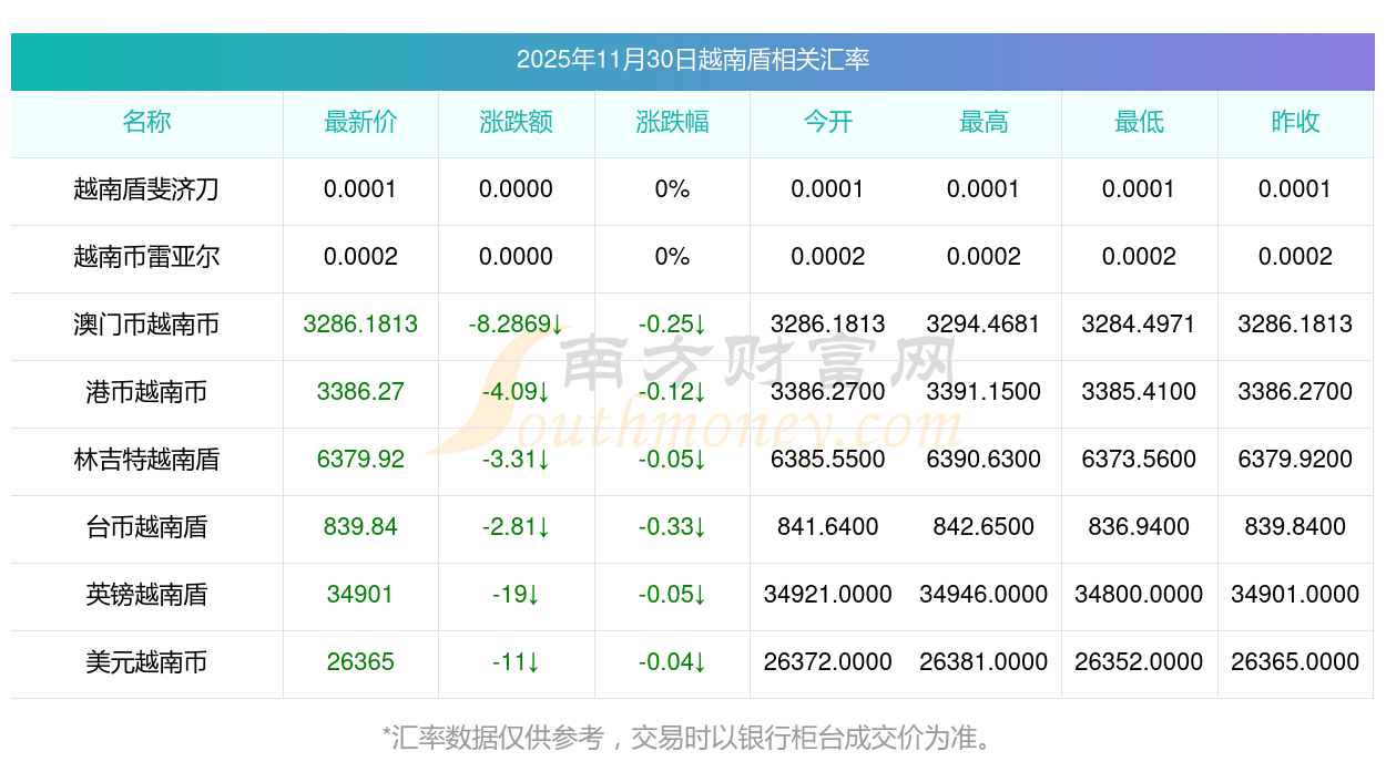2025年11月30日最新消息,越南盾兑换匈牙利福林最新汇率为0.012481,今开为0.0125,昨收为0.0125,最高为0.0125,最低为0.0125。